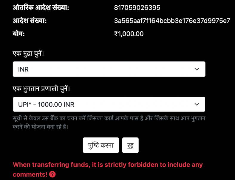 7. Then transfer the funds through your bank to the received details. The amount should be exactly as in the invoice. Any Indian banks operating with UPI and IMPS are supported.